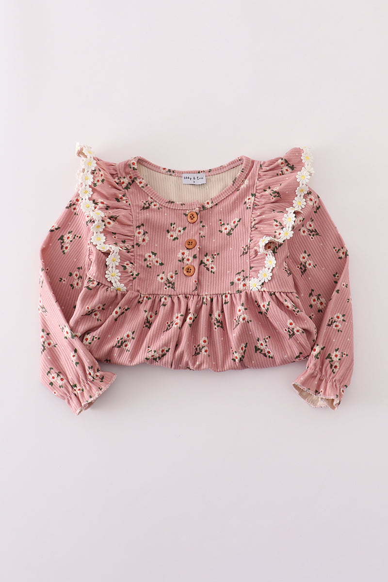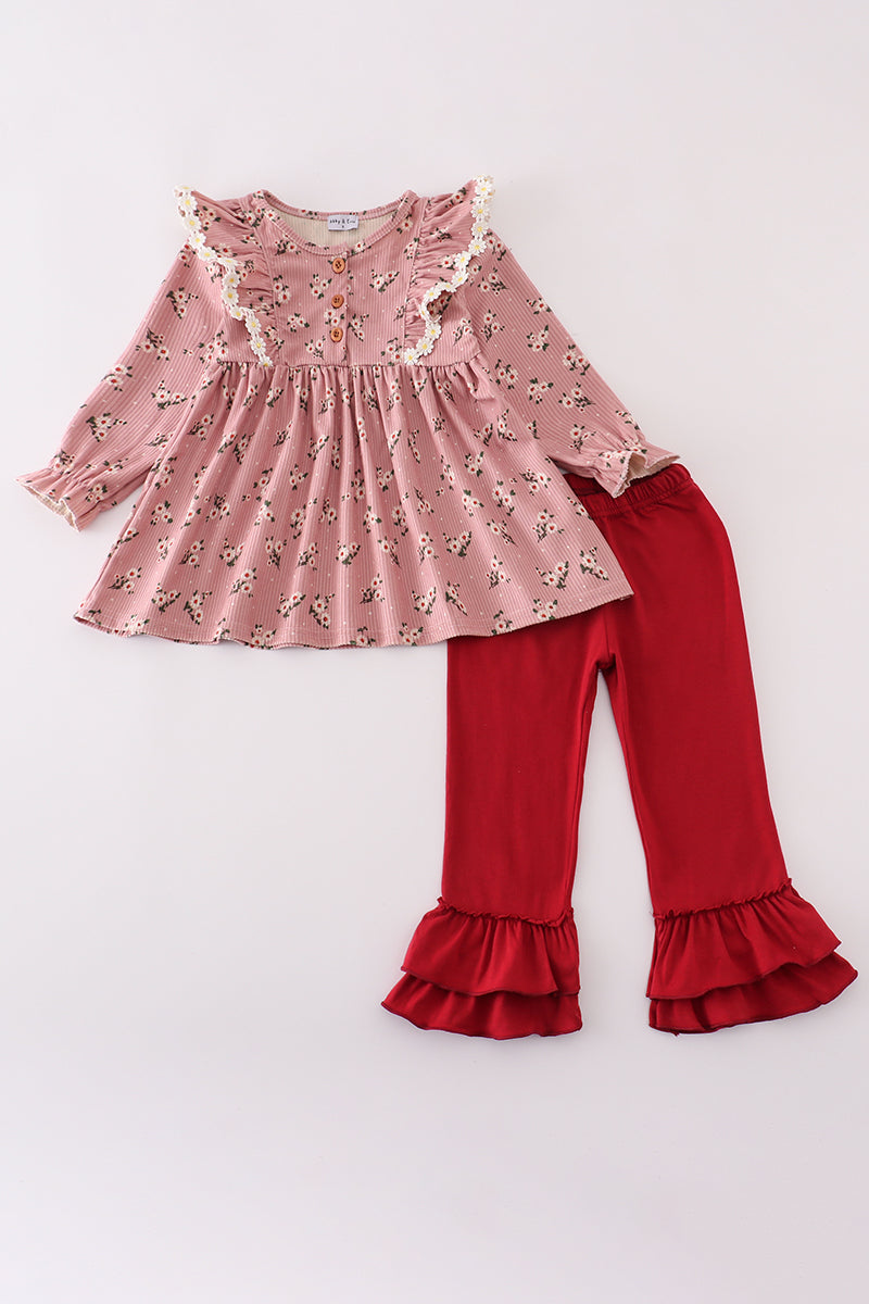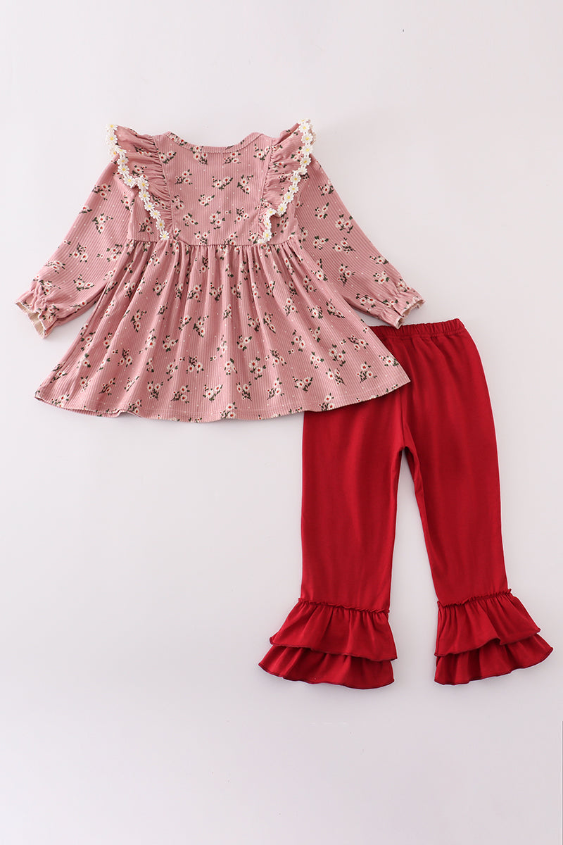 Step into charm and comfort with this Floral Corduroy Lace Ruffle Pants Set. Soft corduroy fabric meets delicate lace and playful ruffles, creating a whimsical outfit perfect for brightening any day. Whether lounging or out on an adventure, this set adds a touch of fun and flair to your wardrobe.