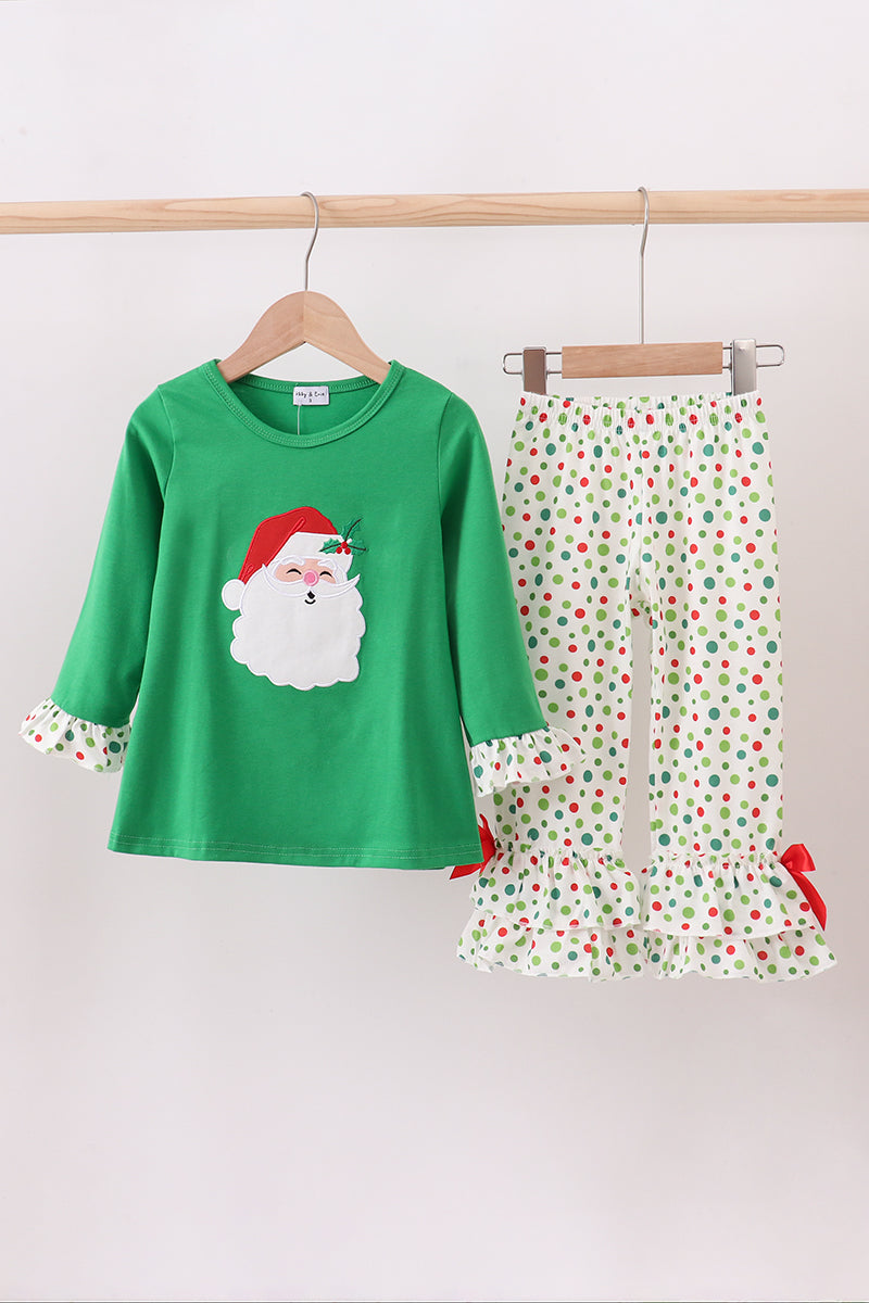 Bring festive cheer with this Green Santa Claus Applique Ruffle Pants Set. Featuring a playful Santa applique and charming ruffle details, this set adds holiday fun to any outfit. Soft and comfortable, it’s perfect for celebrating the season in style and spreading smiles wherever you go.