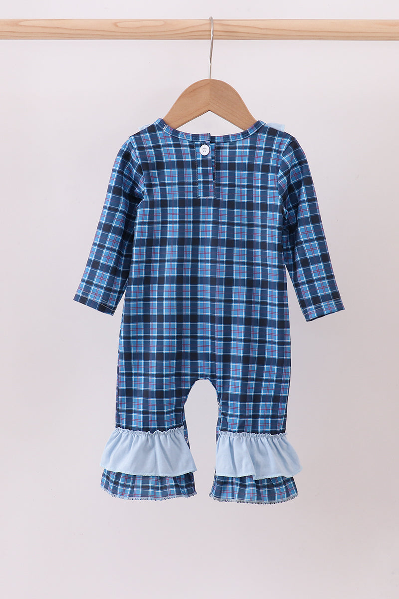 Dress your little one in festive charm with this Navy Nativity Embroidery Plaid Ruffle Romper. Featuring delicate nativity details and playful ruffles, this romper blends holiday spirit with cozy plaid comfort. Perfect for joyful celebrations and picture-perfect moments, it’s as adorable as it is comfy.