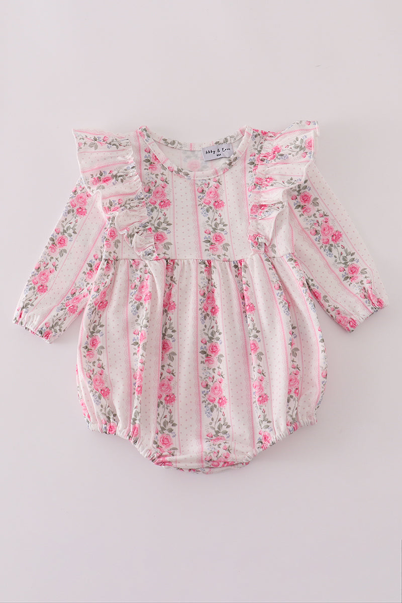 Add a splash of fun to your little one’s wardrobe with this Pink Floral Print Ruffle Bubble. Featuring charming ruffles and a lively floral pattern, it’s perfect for playful days and sunny adventures. Soft and comfy, this bubble romper lets your child move freely while looking absolutely adorable.